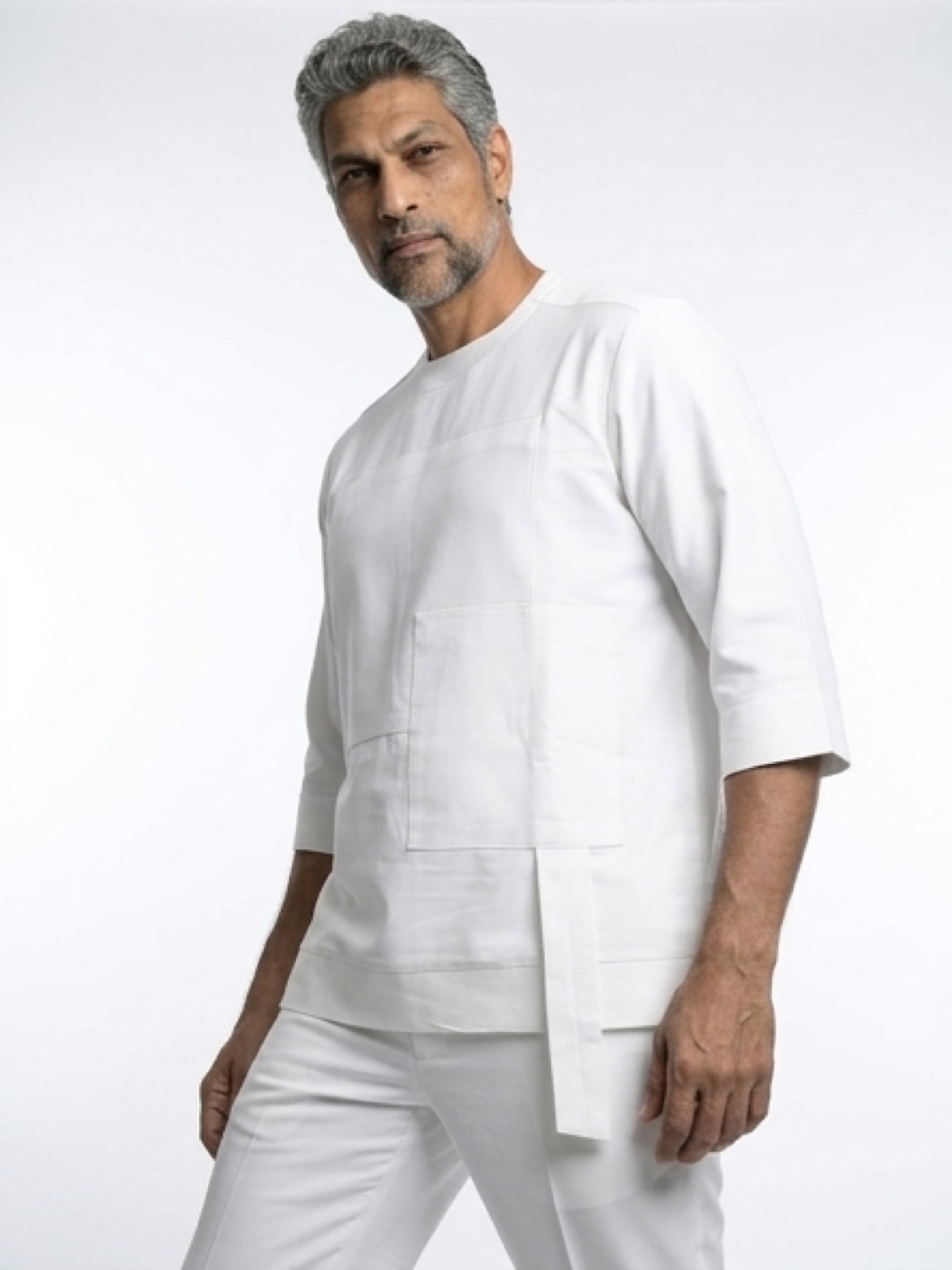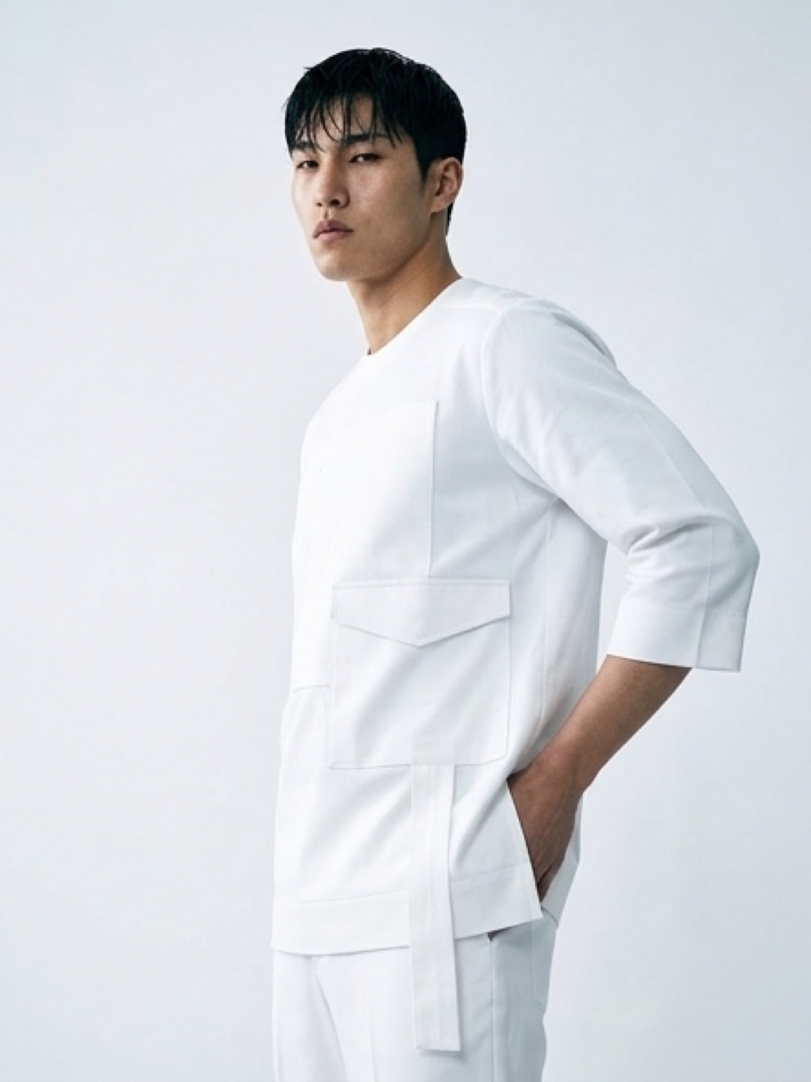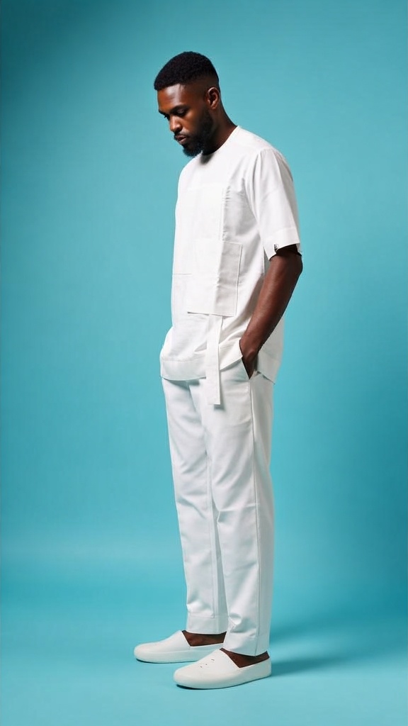 Keep the look unified and grounded by pairing this set with tobacco-colored leather loafers (as shown) to provide a warm, organic contrast. A simple silver or white-gold luxury watch will perfectly complement the cool, clinical purity of the white fabric for a look of unyielding, modern authority