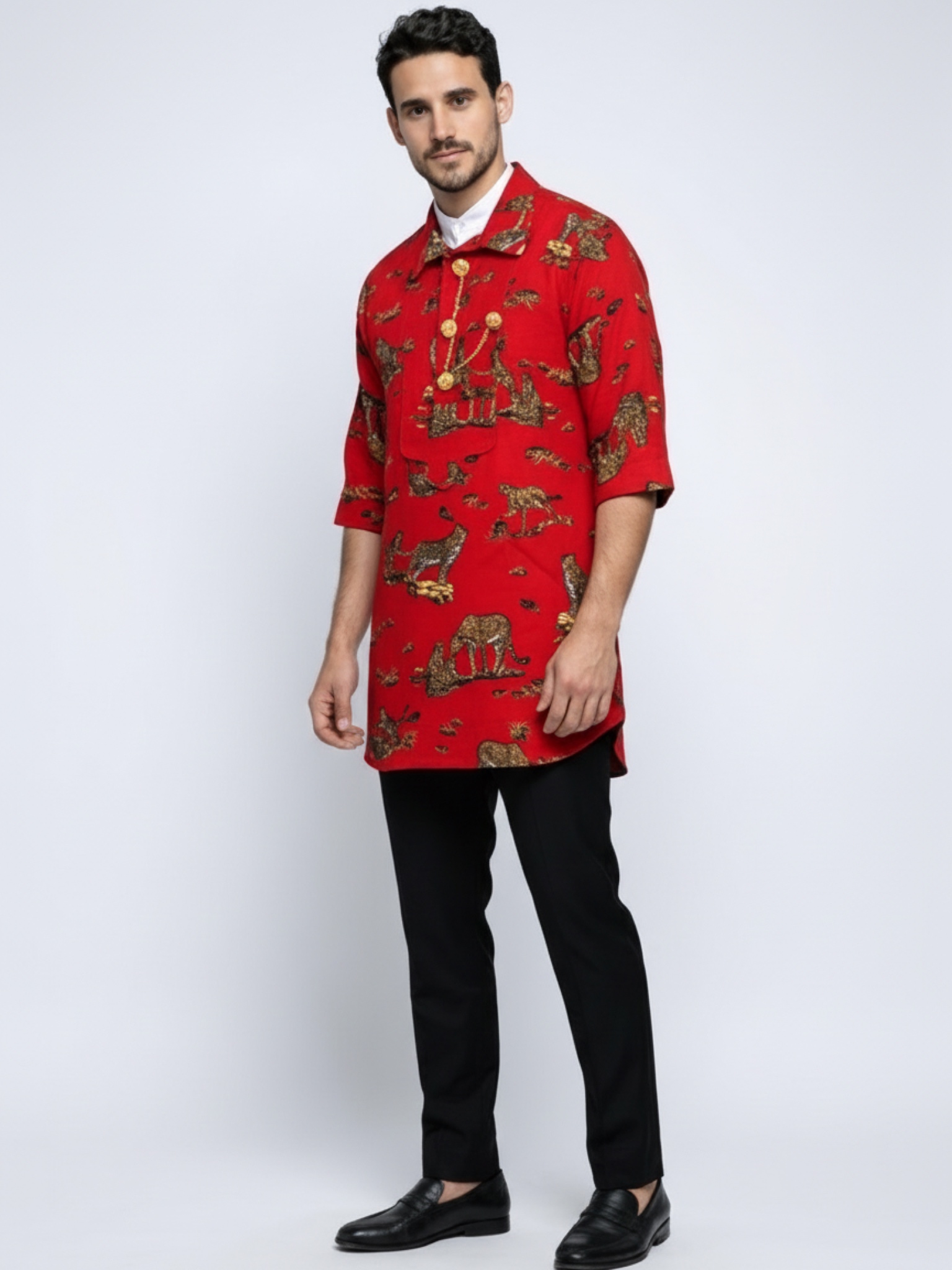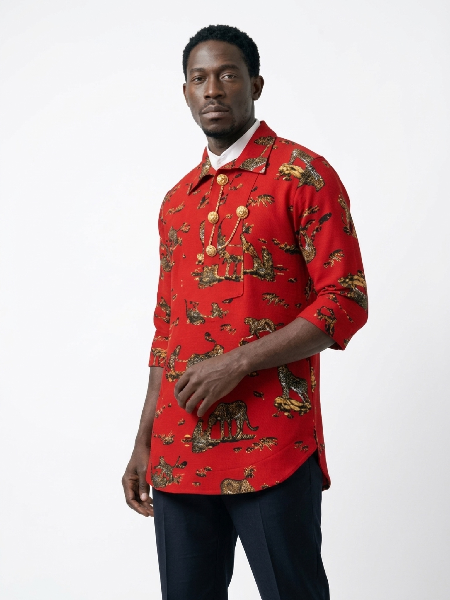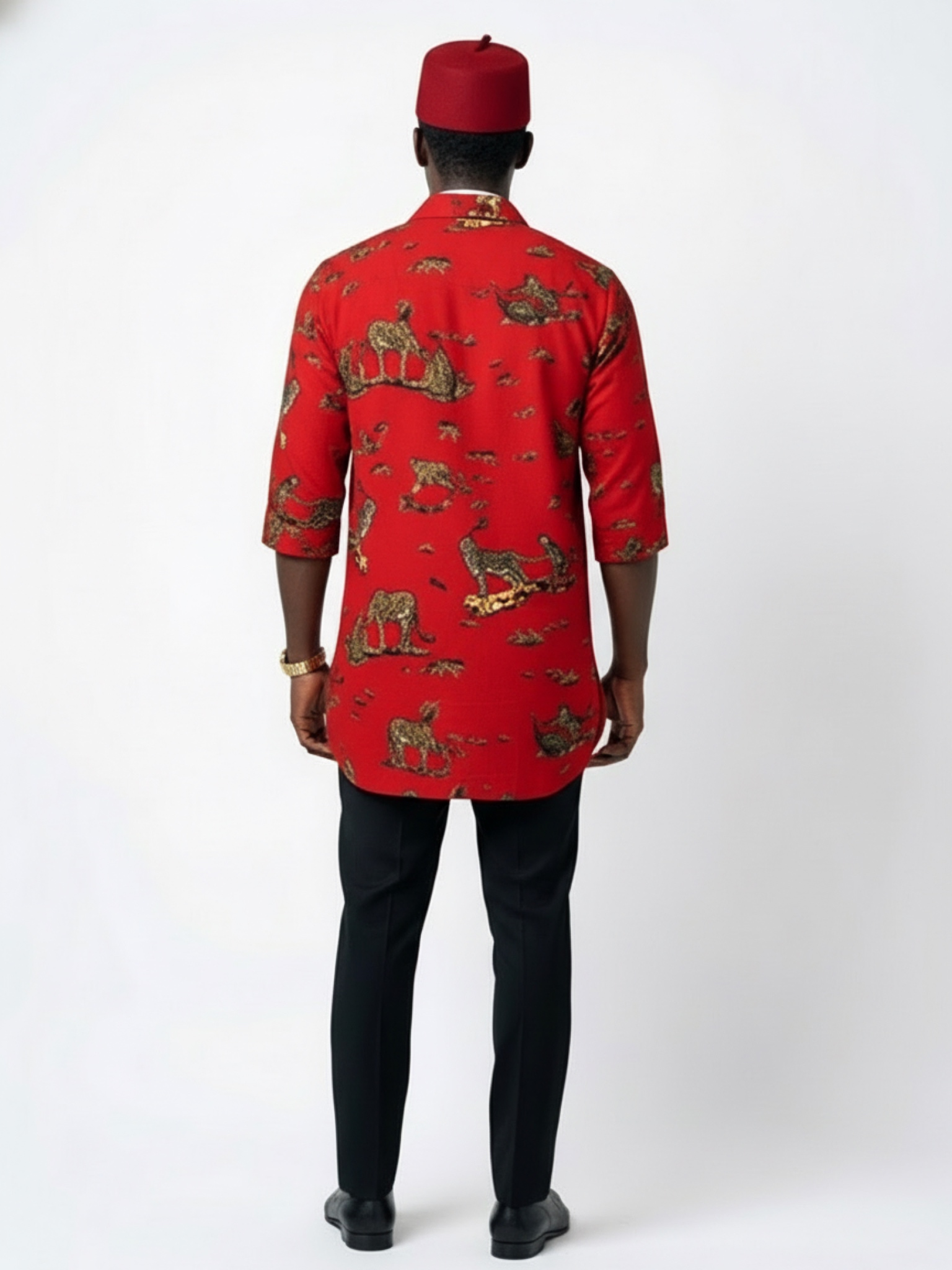 Elevate your wardrobe with a piece that commands respect. This modern take on the classic Isiagu features a vibrant crimson fabric adorned with the iconic gold leopard motif, symbolizing strength and leadership. Designed with a clean, tailored fit and contemporary mid-length sleeves, it bridges the gap between cultural heritage and high-fashion minimalism. Whether youβre heading to a traditional ceremony or a high-profile gala, the Odogwu Regal Tunic ensures you are the most distinguished person in the room.