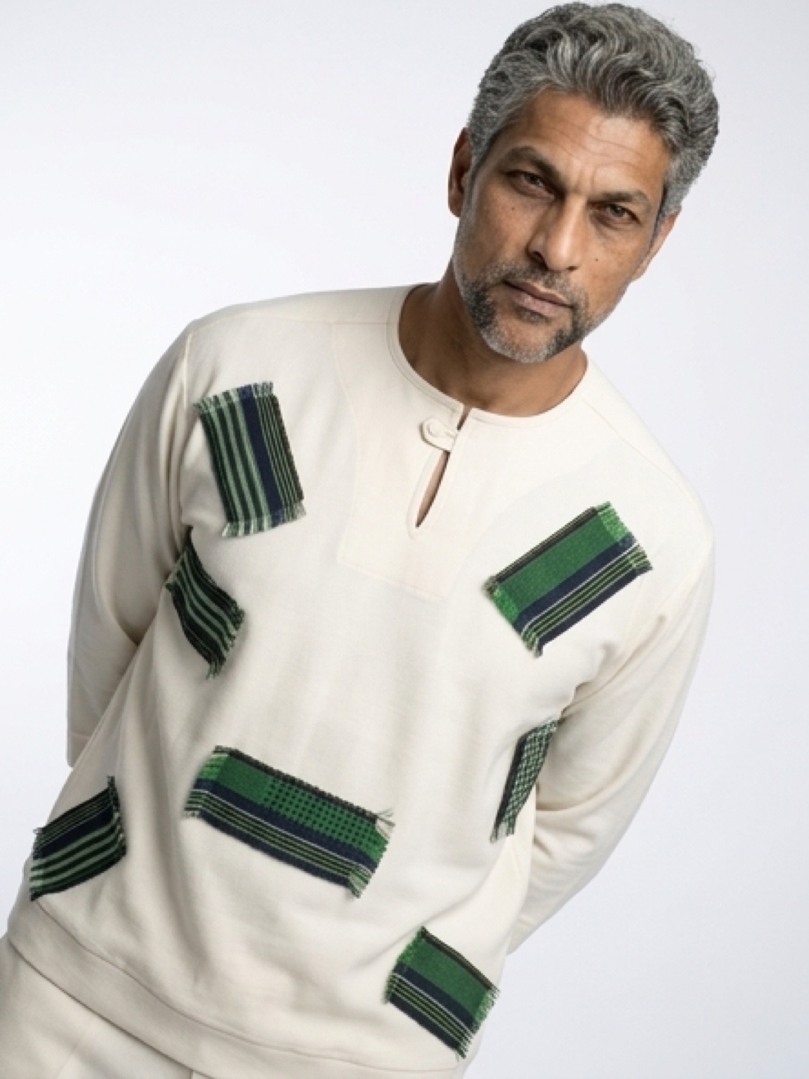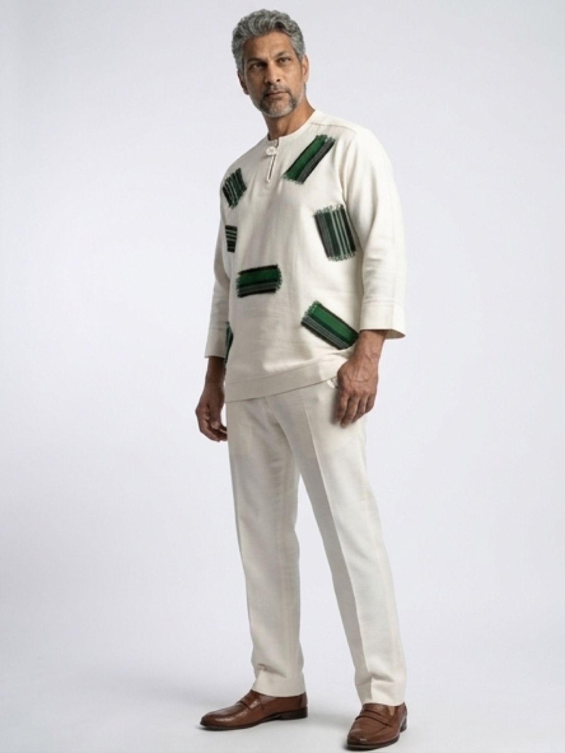 Experience the luxury of texture. The Alabaster Verdant-Patch Signature Senator is designed for the visionary who appreciates the beauty of craftsmanship. This piece features a pristine off-white base accented by hand-placed, forest-green woven patches with intentional raw-edge fringing. These organic elements create a striking visual rhythm, moving across the garment like a landscape. Tailored with a clean keyhole neckline and relaxed 3/4 sleeves, this set offers a sophisticated, "Old Money" aesthetic that is perfect for cultural showcases, luxury garden events, or creative high-end retreats.