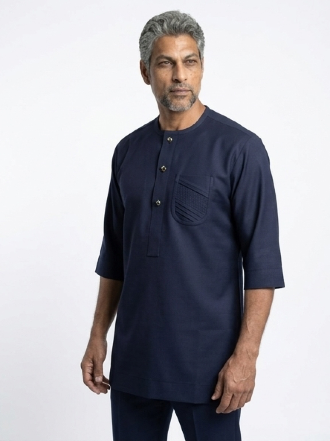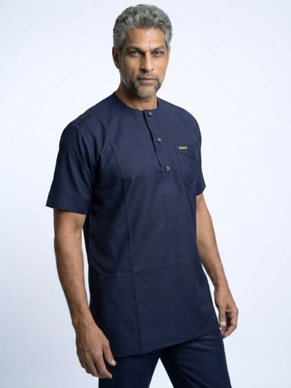 This design is the ultimate expression of nautical luxury and clinical precision. It moves away from heavy embellishments toward a razor-sharp, monochromatic aesthetic that prioritizes high-impact minimalism.Command attention with the purity of the Arctic Navy Senator. This ensemble is a masterclass in high-contrast luxury, featuring a crisp, optic-white body paired with deep navy-blue accents. The defining feature is the uniquely structured chest pocket, which boasts intricate tonal stitching and three polished metallic studs for a touch of industrial class. With its clean, collarless neckline and tailored 3/4 sleeves, this set offers a powerful, streamlined profile that is perfect for summer board meetings, high-stakes networking, or an exclusive coastal retreat.Key Features to Highlight: