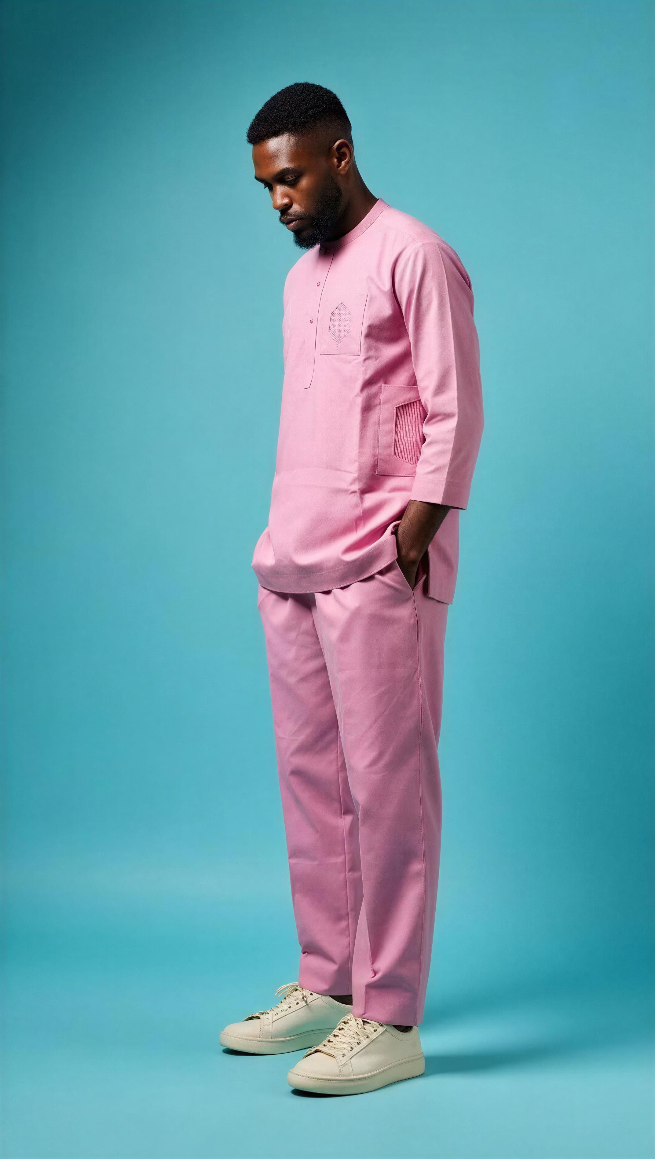 Keep the look clean and balanced by pairing this set with off-white or cream leather sneakers (as shown). A silver luxury watch and a minimalist silver ring will perfectly complement the cool undertones of the pink fabric, completing a look of unyielding, modern authority.