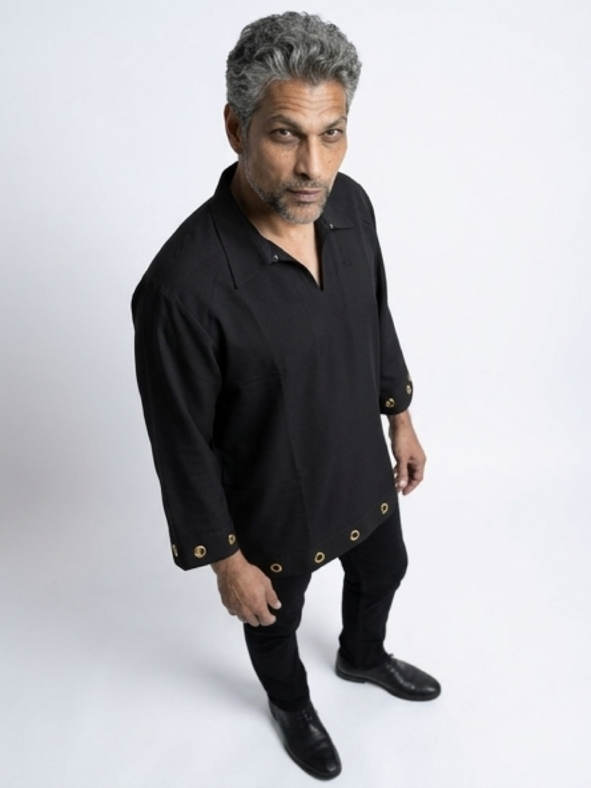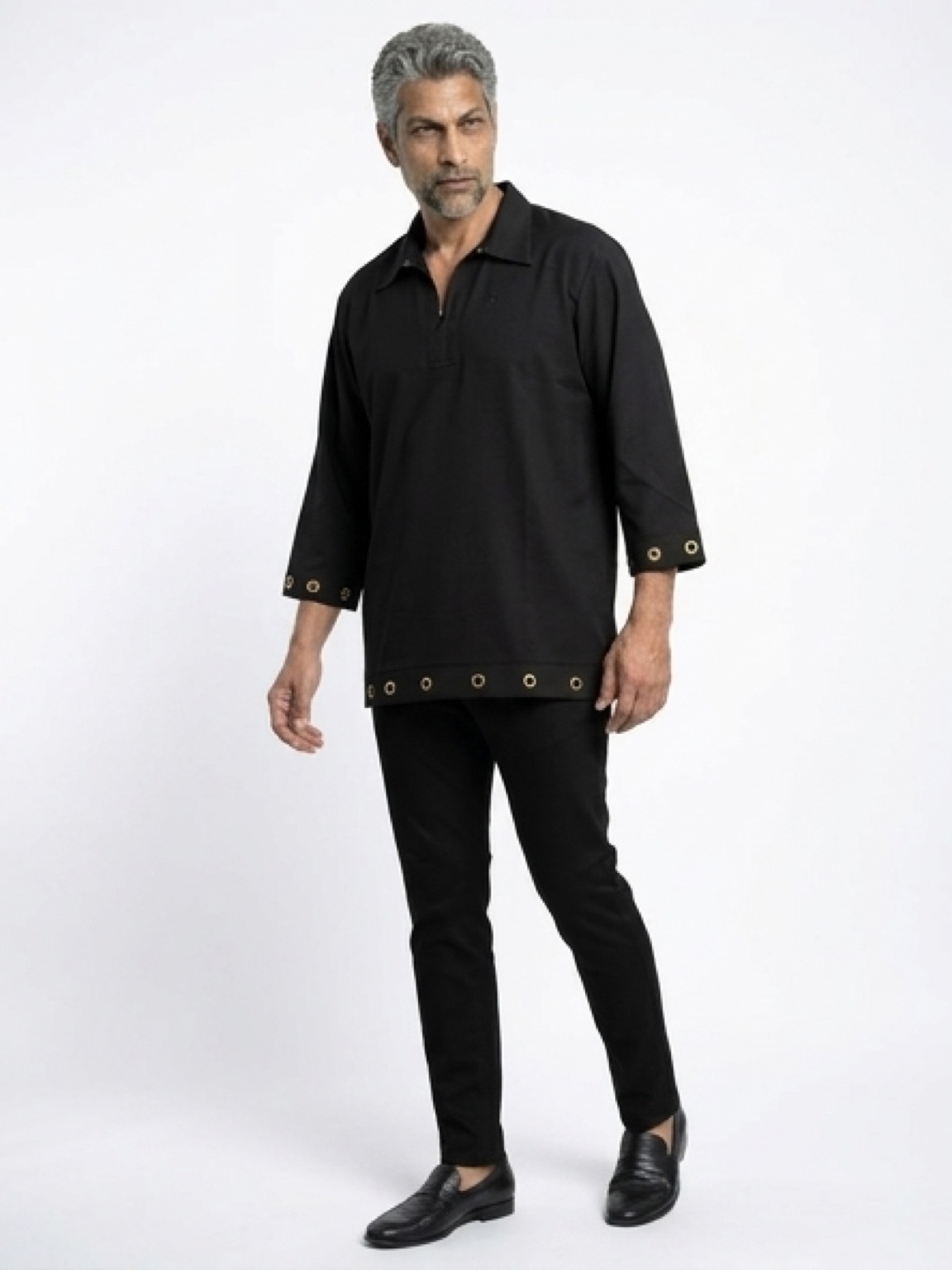 This deep-black ensemble features a signature wide-spread collar and an architectural 3/4 sleeve cut. The defining feature is the meticulously placed gold-toned eyelets that line the hem and cuffs, adding a touch of industrial luxury to a classic silhouette. Tailored for a crisp yet relaxed drape, this set transitions perfectly from a high-stakes media event to an exclusive night on the town.