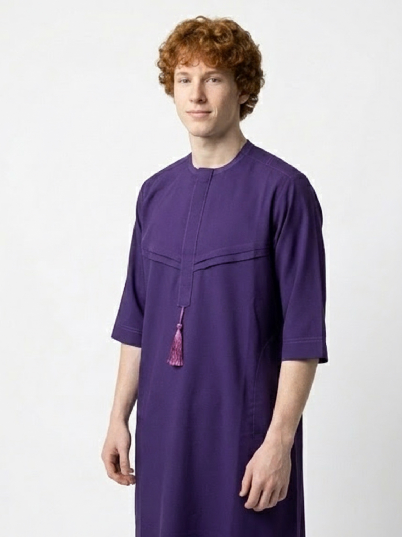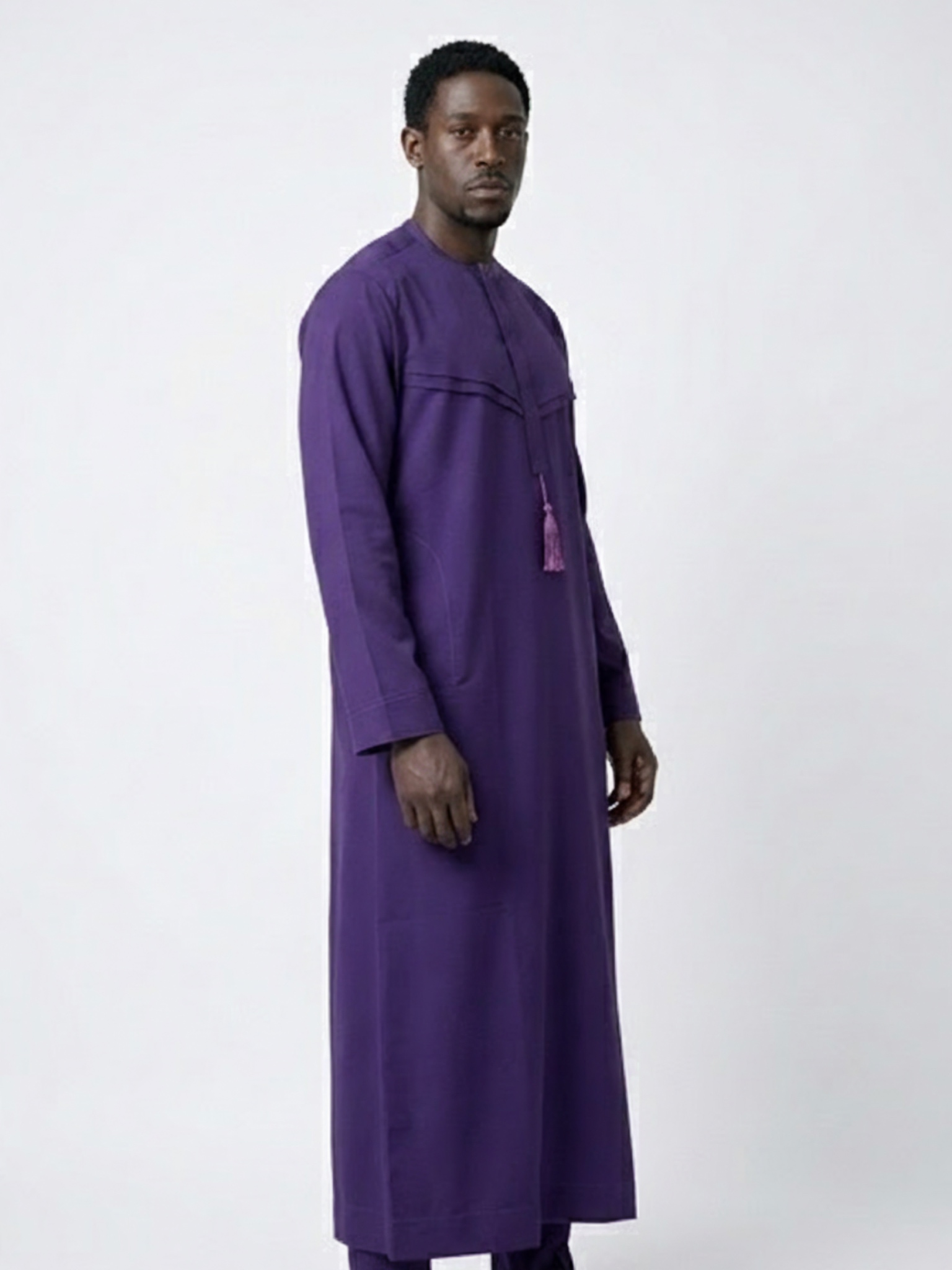Experience ultimate comfort without sacrificing style. Our Deep Violet Signature Jalabiya is crafted from premium, lightweight fabric designed for a soft, breathable feel and a perfect drape. The minimalist aesthetic is elevated by structured chest paneling and a sleek collarless neckline. Whether you're attending a festive celebration or looking for a refined leisure look, this piece delivers a sharp, polished aesthetic that is effortlessly cool.