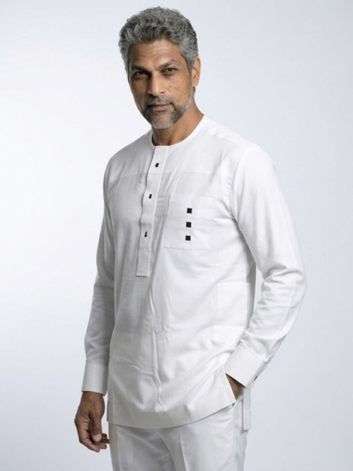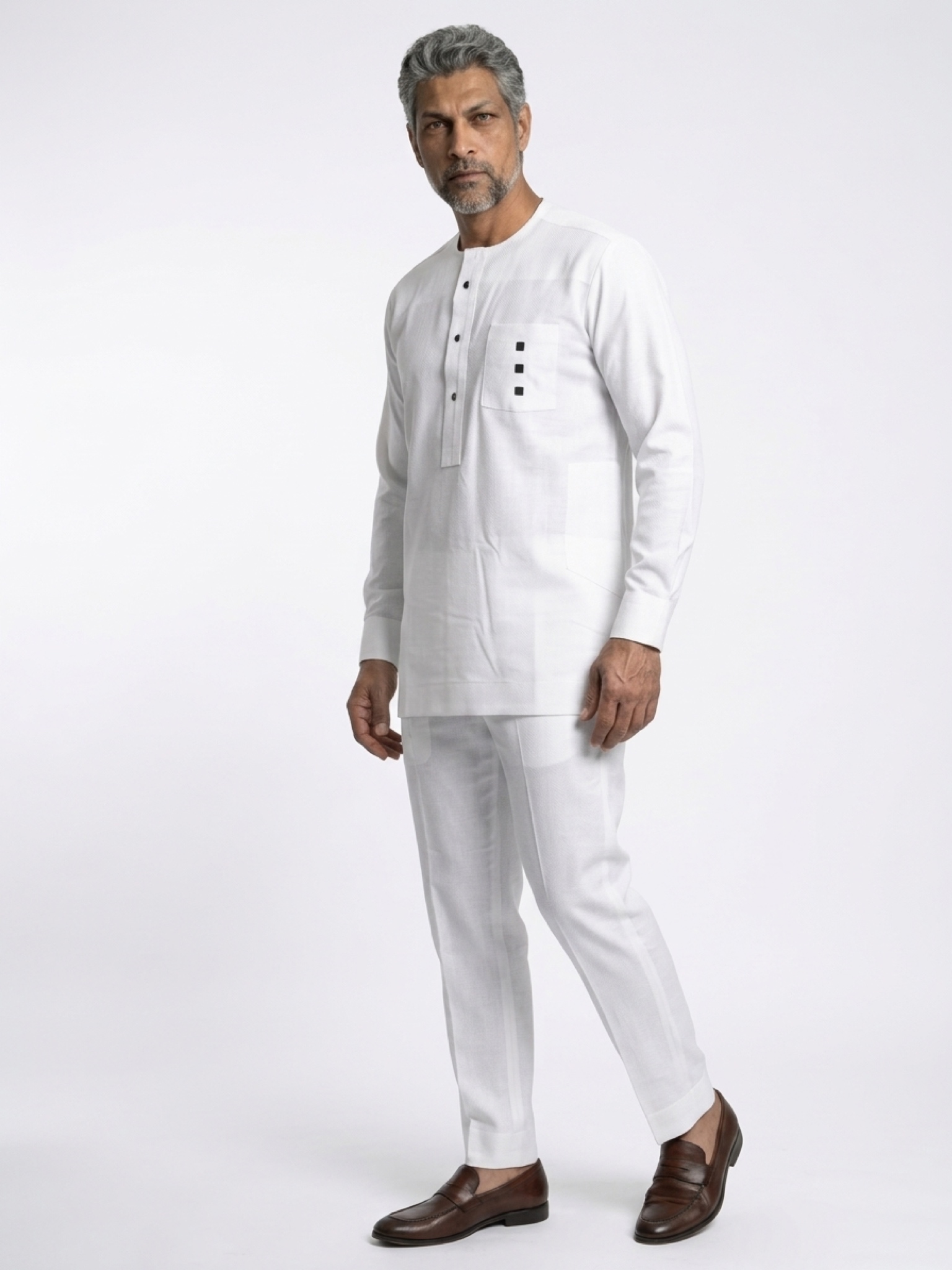 Redefine your signature style with a garment that balances traditional tailoring with contemporary art. The striking contrast of black buttons and geometric pocket studs against a backdrop of flawless white fabric. With its slim-cut sleeves and structured fit, this set offers a sharp, professional aesthetic that is both timeless and ahead of its time. Itβs not just an outfit; itβs a statement of excellence and refined taste.