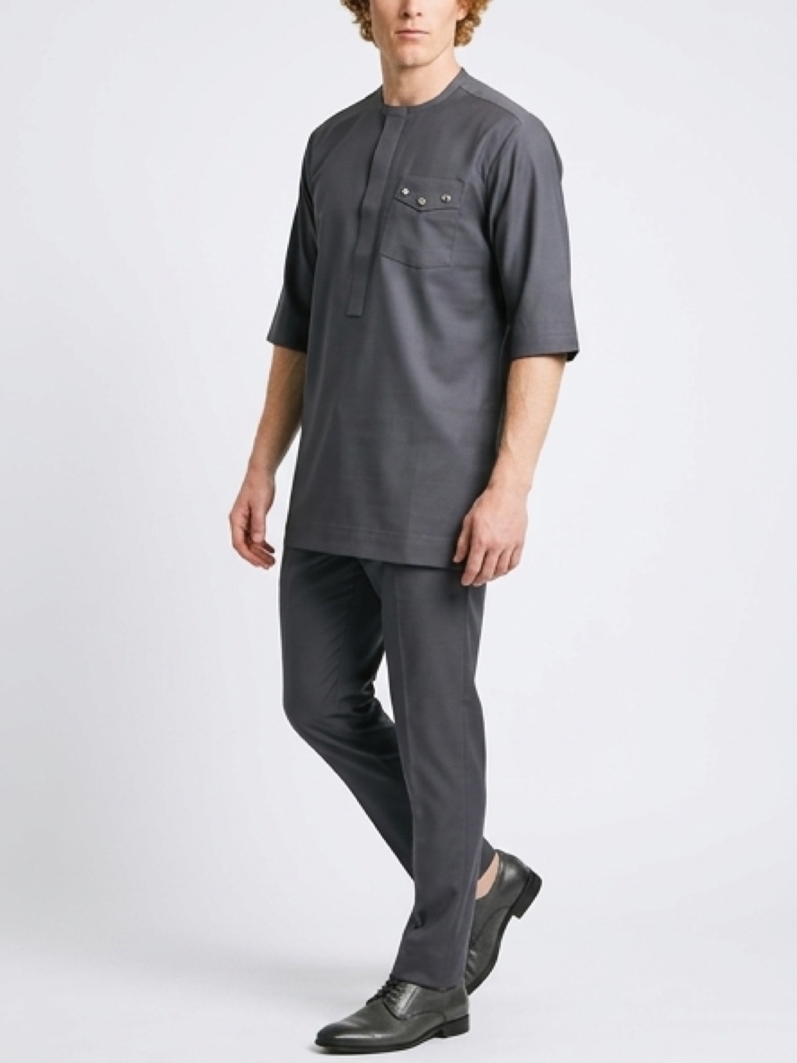 Where technical mastery meets contemporary "Old Money" style. Our Graphite Chevron-Detail Kaftan redefines the standards of modern executive wear. The premium, high-density fabric provides a structured, stay-sharp drape that resists creasing throughout the day, while the tonal grey palette offers a high-status alternative to traditional neutrals. Featuring a seamless hidden-placket front and precision-tapered trousers, this two-piece set is designed for the visionary who appreciates the power of subtle, high-end craftsmanship.
