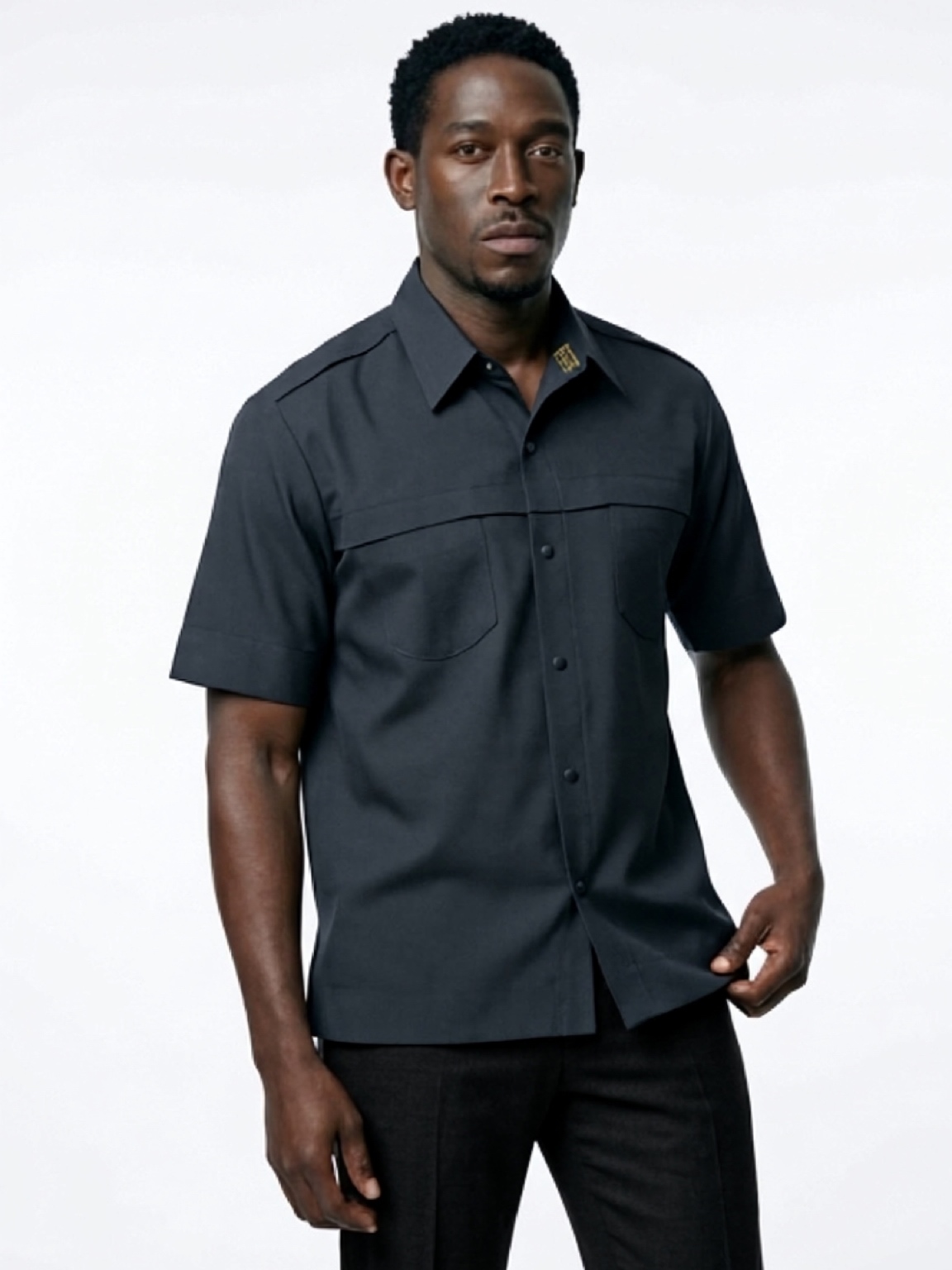 Where urban utility meets executive luxury. The Midnight Shadow Senator is a versatile staple for the modern wardrobe. Featuring a refined, structured fit and a subtle gold-crown lapel insignia, this shirt balances a tough, industrial aesthetic with high-end luxury details. The premium, breathable fabric ensures all-day comfort, while the monochromatic black-on-black design provides a look of quiet, undeniable authority. Elevate your daily rotation with a piece that is as resilient as it is refined.