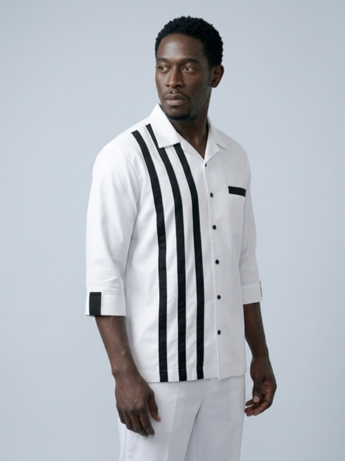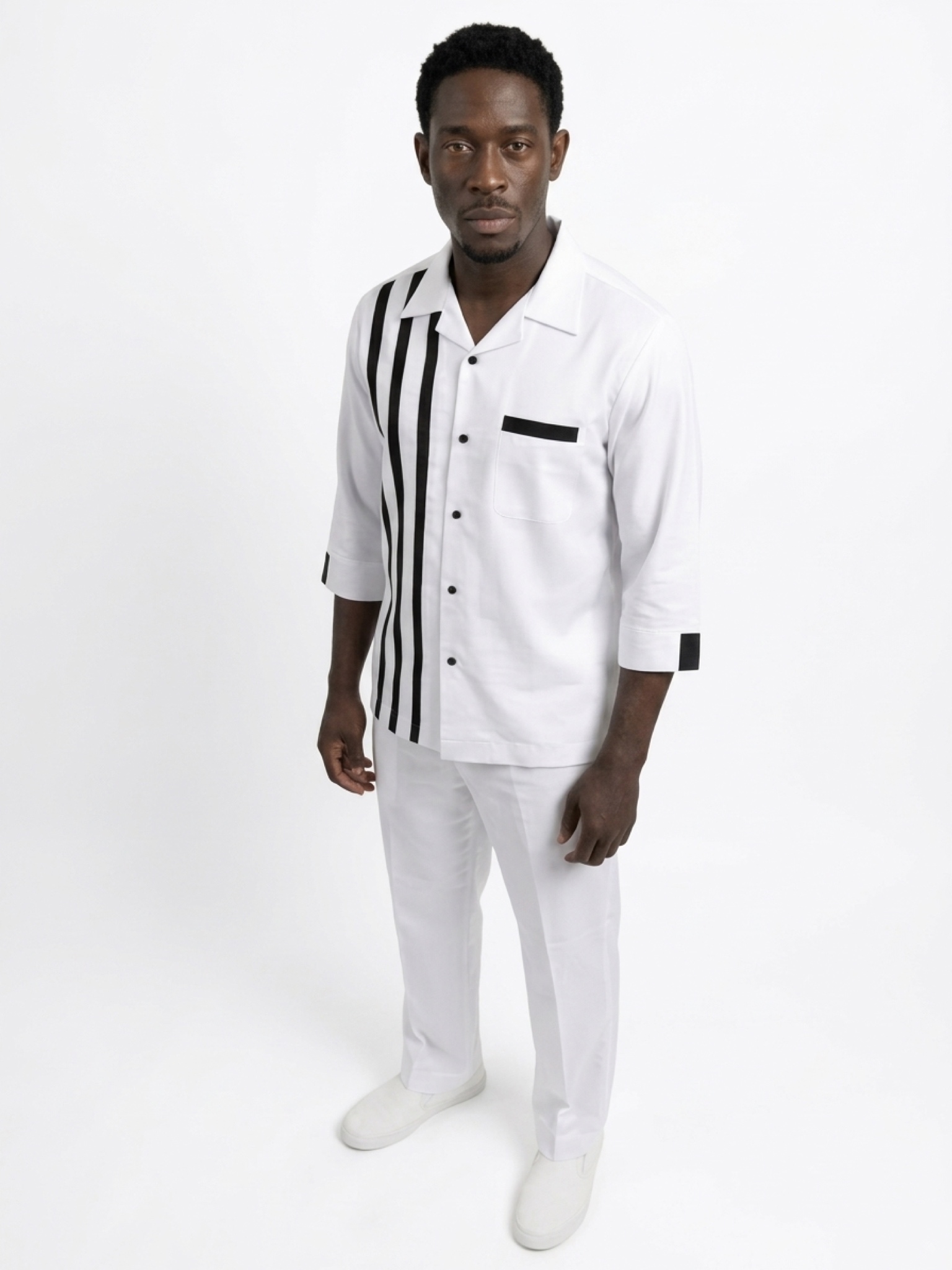 Style at full throttle. The Monaco Striped Resort Shirt is designed for the man who lives in the fast lane. Featuring a crisp optic-white base, this shirt is defined by triple-black vertical racing stripes that add a bold, athletic edge to a refined silhouette. The open notched collar and lightweight, breathable fabric offer a relaxed "Old Money" leisure vibe, while the sharp monochromatic contrast maintains a sense of high-end authority. Whether youβre on a private yacht or at a premium rooftop lounge, this piece ensures you remain the center of attention.