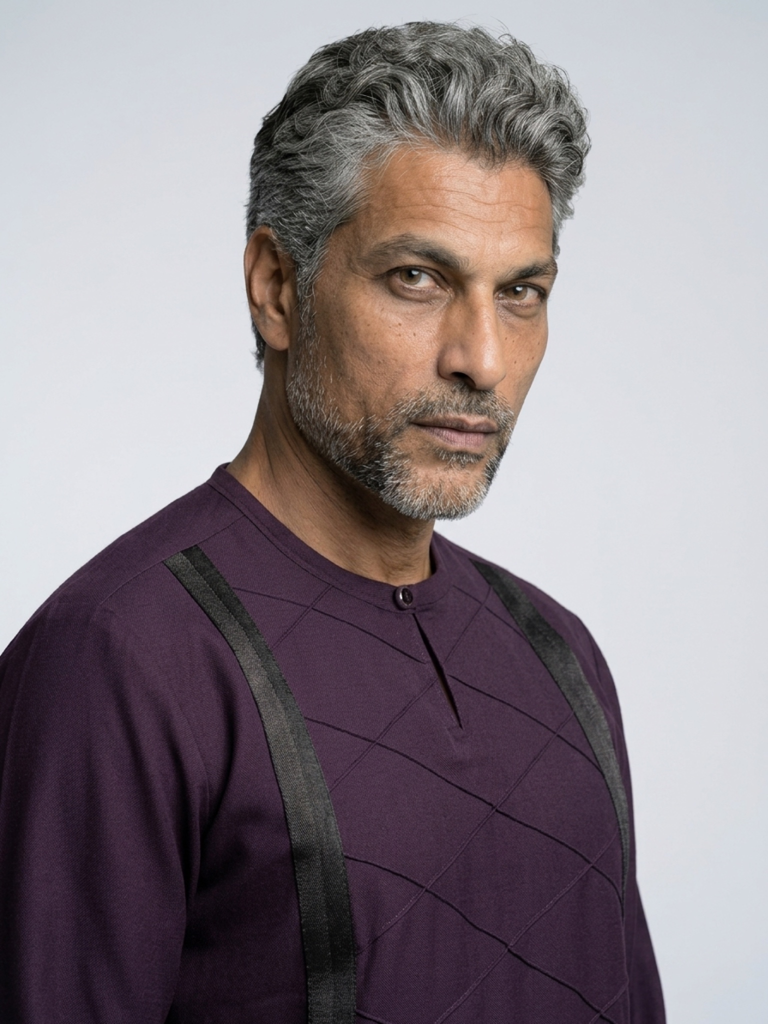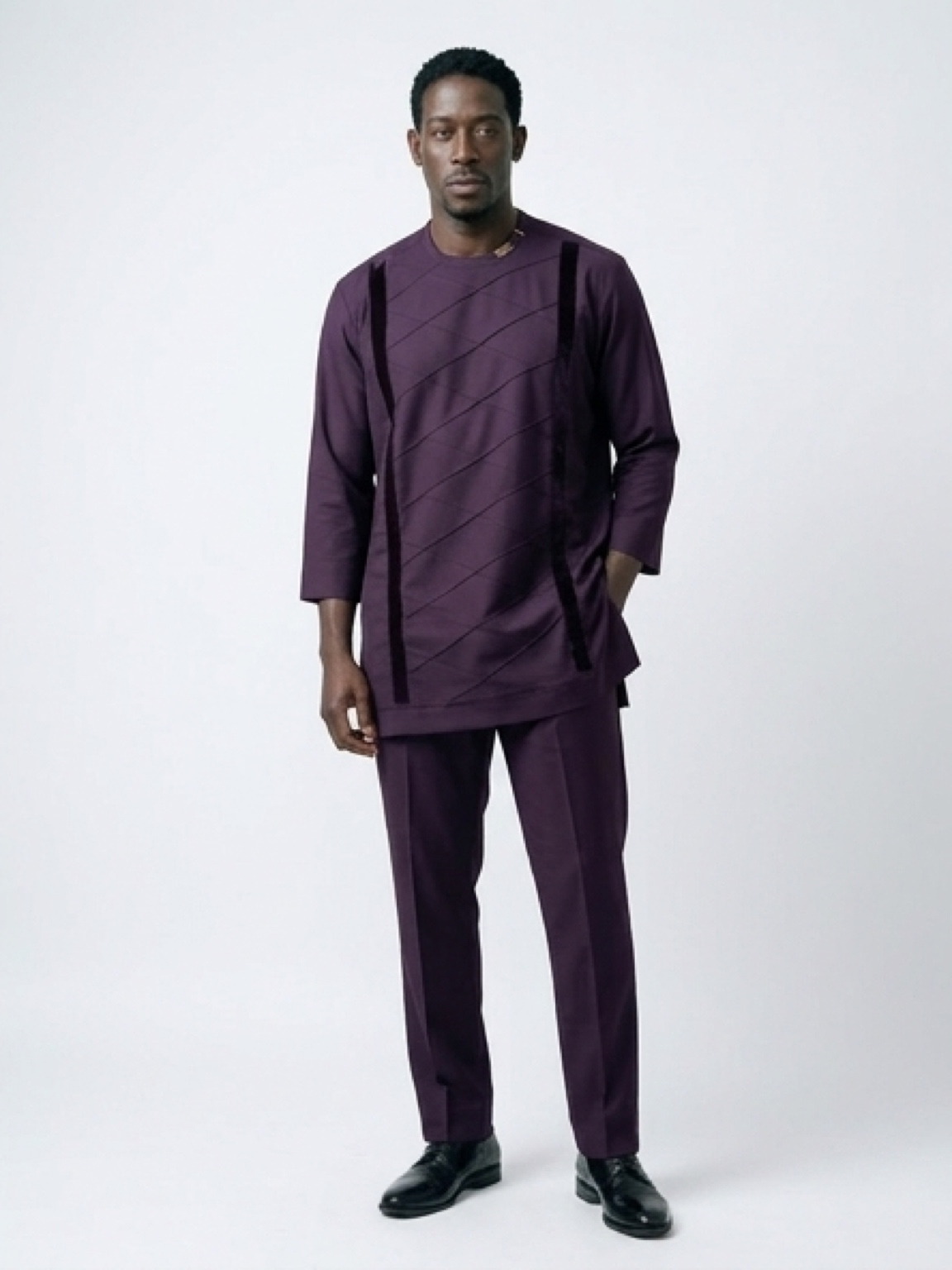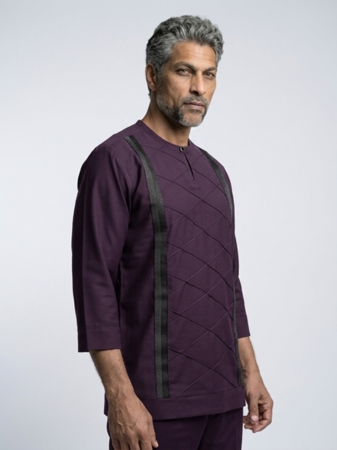 This design is a masterclass in Textural Complexity and Regal Craftsmanship. It blends a rich, royal palette with intricate geometric hand-work, creating a look that is both deeply traditional and strikingly modern.Experience the peak of artisanal luxury. The Royal Amethyst Senator is designed for the man who values heritage and high-concept design. This set features a deep, saturated plum hue, defined by a stunning hand-folded lattice texture across the central chest panel. This intricate diamond-patterned work is framed by two vertical bands of bespoke bronze embroidery, adding a touch of metallic brilliance to the garment. With its structured 3/4 sleeves and tailored trousers, this ensemble offers a powerful, commanding profile for high-end galas, cultural celebrations, and exclusive social events.