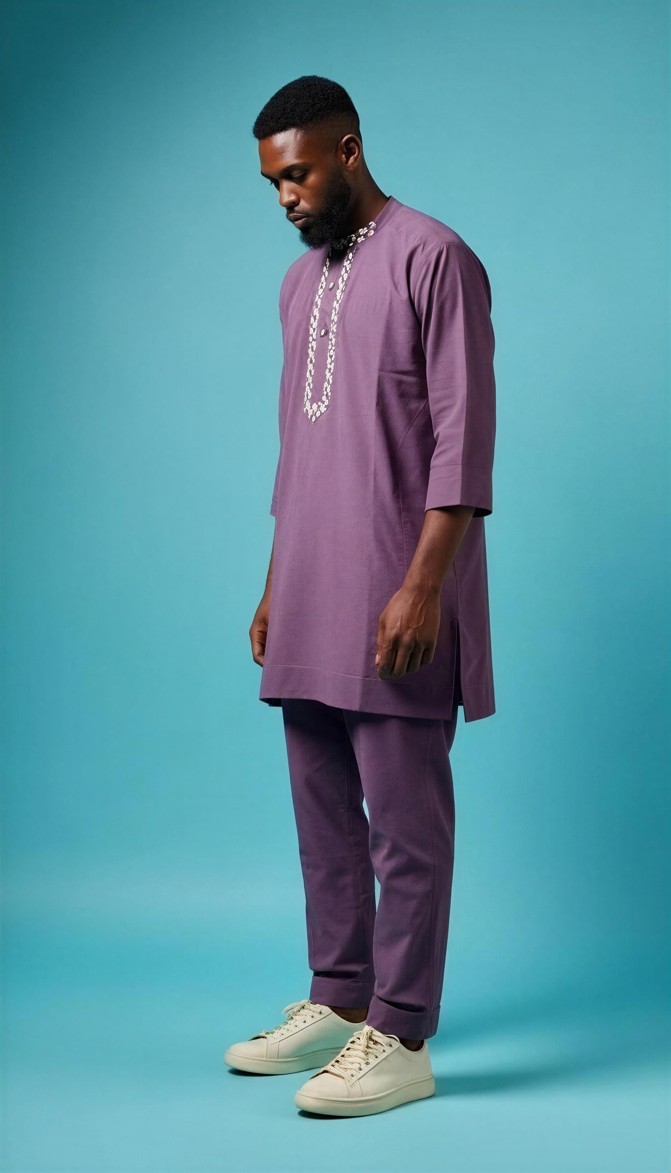 Where clinical precision meets high-fashion restraint. Our Royal Violet Executive Kaftan redefines the standards of modern traditional wear. The premium-weight technical fabric provides a substantial, stay-sharp drape that reflects uncompromising quality, while the intricate neck-panel embroidery serves as a bold visual signature. Featuring a reinforced hidden-placket front and a modern "Sculpted Fit," this two-piece set is designed for the global visionary who appreciates the power of subtle, high-end craftsmanship.