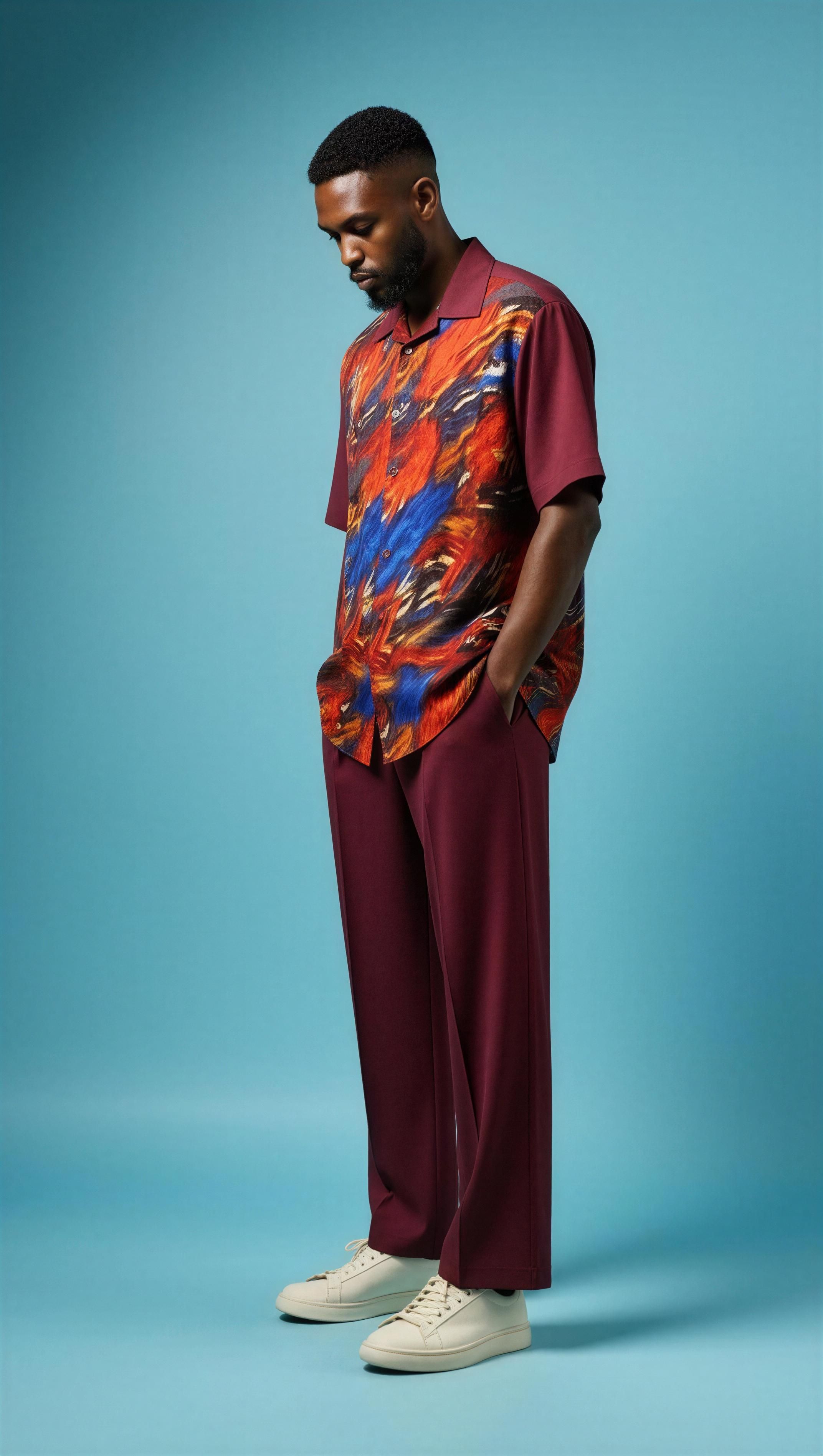 Where clinical precision meets expressive luxury. Our Deep Wine Safari Signature set redefines the modern vacation wardrobe through a lens of contemporary abstraction. The premium, breathable fabric provides a structured drape that radiates quality, while the hand-painted aesthetic of the main body serves as a bold visual signature for the man of substance. Featuring a reinforced button placket and precision-tapered maroon trousers, this ensemble is designed for the global professional who commands attention through unique, high-end details and a commitment to progressive style.