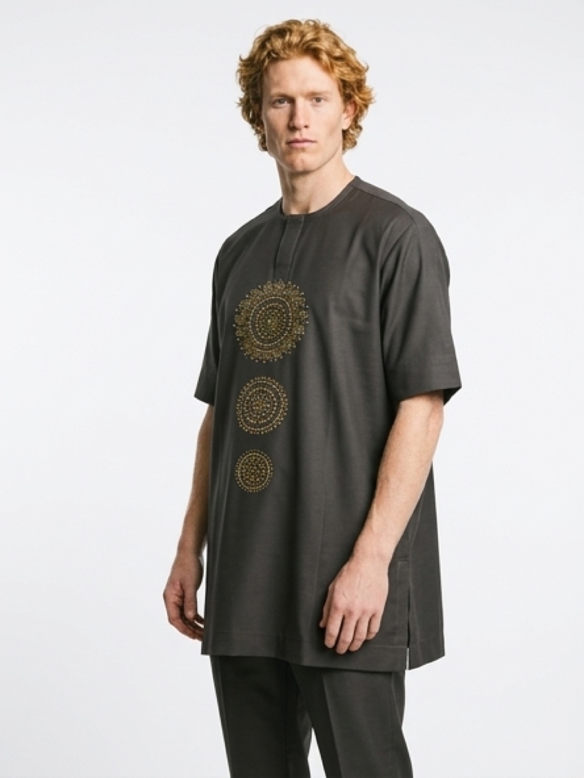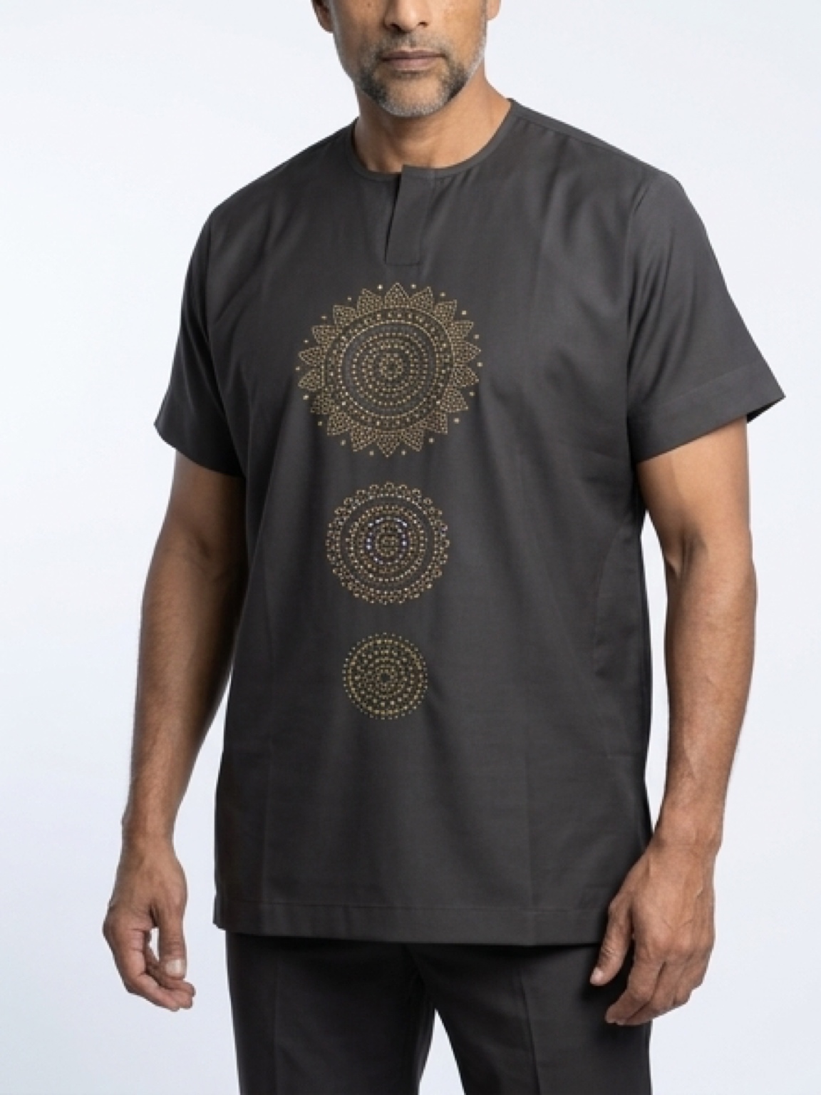 Designed for the visionary who radiates influence. This set features a deep, slate-charcoal palette that serves as a sophisticated canvas for three hand-detailed, golden mandala motifs descending the chest. These intricate circular patterns symbolize unity and precision, while the subtle gold-tone finish adds a level of premium detail that catches the light beautifully. With its modern short sleeves and sharp crew neckline, this set offers a streamlined, authoritative profile for high-stakes summits, creative launches, or exclusive evening gatherings.